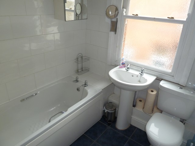 With double glazed sash windows to side and rear, green leather sofa, leather armchair, folding dining table and four chairs. Wall mounted 42 inch TV with Freeview HD.
